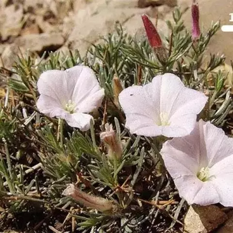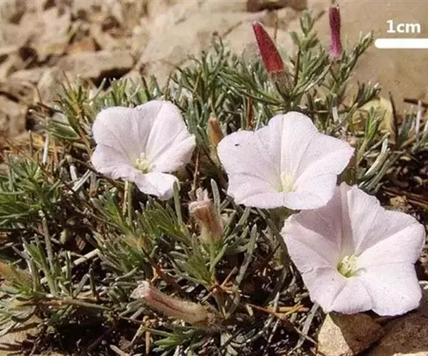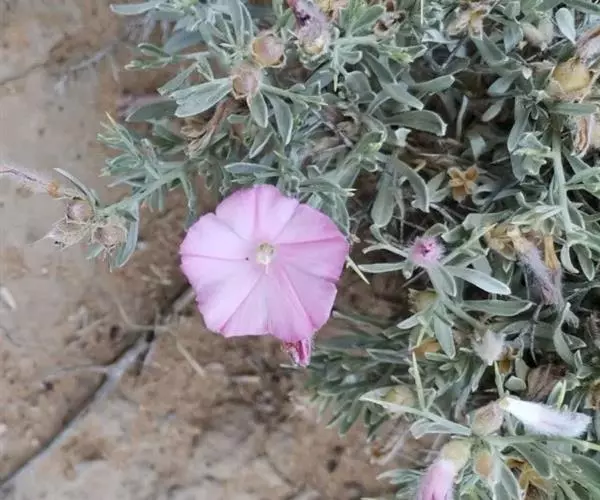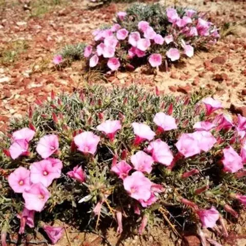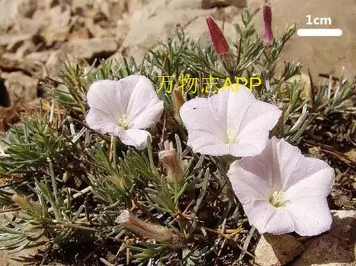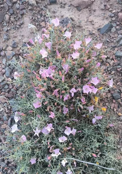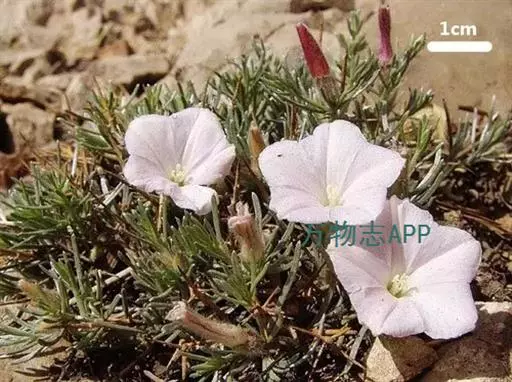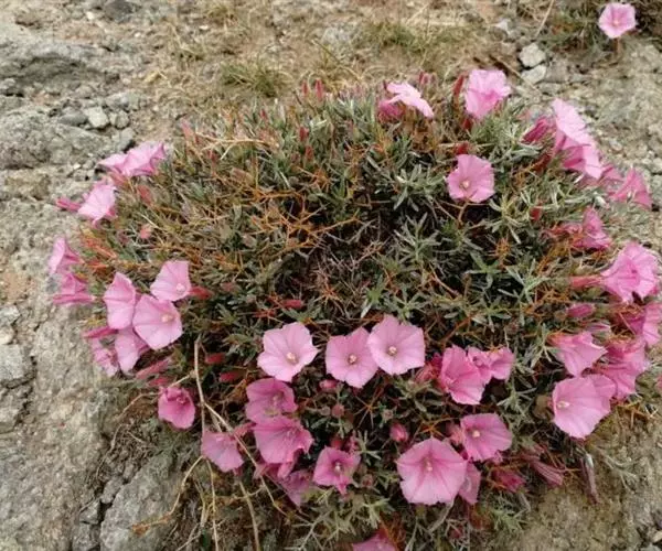 匍匐有刺亚灌木,全体被银灰色绢毛,高4-10-(15)厘米,茎密集分枝,形成披散垫状;小枝坚硬,具刺;叶狭线形,或稀倒披针形,长0.5-2厘米,宽0.5-4(5-6)毫米,先端圆形,基部渐狭,无柄,均密被银灰色绢毛。花2-5(-6)朵密集于枝端,稀单花,花枝有时伸长,无刺,花柄长2-5毫米,密被半贴生绢毛;萼片长5-7(8)毫米,椭圆形或长圆状倒卵形,先端短渐尖,或骤细成尖端,外面被棕黄色毛;花冠漏斗形,长15-25毫米,粉红色,具5条密生毛的瓣中带,5浅裂;雄蕊5,不等长,花丝丝状,无毛,基部扩大,较花冠短一半;雌蕊较雄蕊长;子房有毛,2室,每室2胚珠;花柱丝状,柱头2,线形。蒴果球形,有毛,长4-6毫米。种子卵圆形,无毛。花期5-7月。 刺旋花