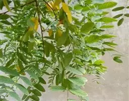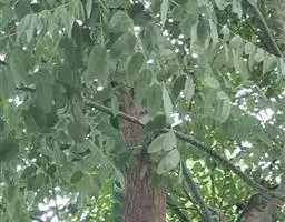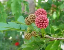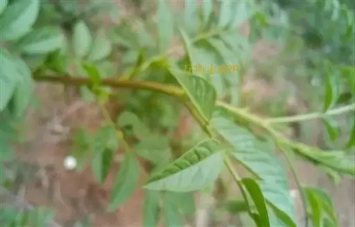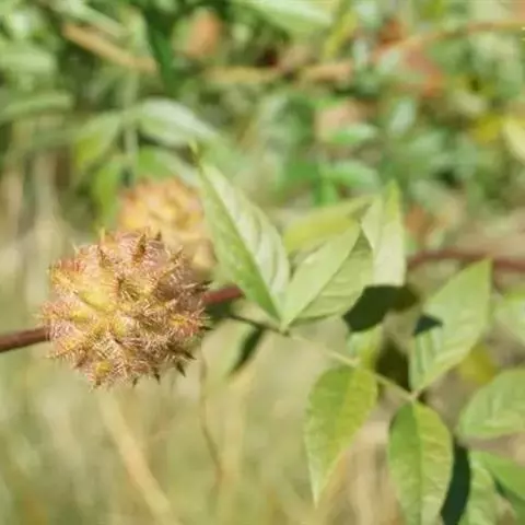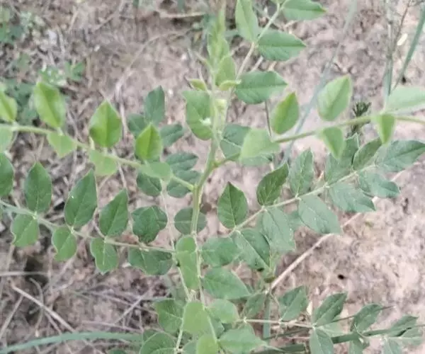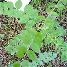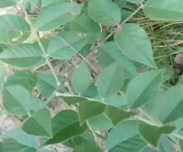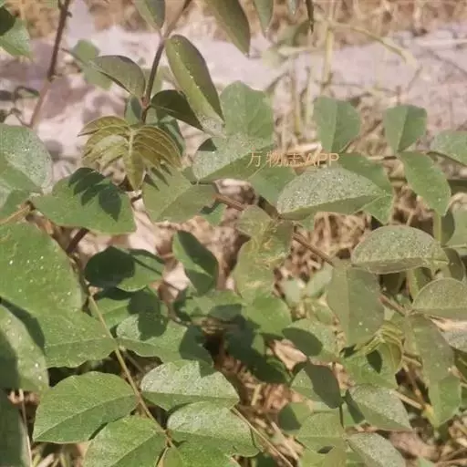 叶长5-20厘米,托叶三角状披针形,长约5毫米,宽约2毫米,两面密被白色短柔毛;叶柄密被褐色腺点和短柔毛;小叶5-17枚,卵形、长卵形或近圆形,长1.5-5厘米,宽0.8-3厘米,上面暗绿色,下面绿色,两面均密被黄褐色腺点及短柔毛,顶端钝,具短 尖,基部圆,边缘全缘或微呈波状,多少反卷。