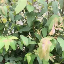 危害症状:病菌主要为害叶片和枝梢。叶片感染初期出现针头状大小的水渍斑,病斑逐渐扩大,组织坏死如被灼伤,边缘有一赤褐色晕圈,后期病斑中部变灰褐色,多数病斑连结造成4叶尖或叶缘枯,病叶卷曲、脆裂脱落。枝条染病,表皮层遍布近圆形或长条形的小点,扩大后若病斑环绕枝干,可造成枝干干枯死亡。在雨后或高湿环境,尤其在靠近地面枝叶的坏死部分,出现密布的白色叉形点状物,即为病菌的分生孢子堆。
