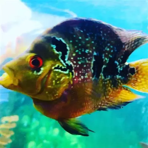 地图鱼形似罗非鱼,但身体更宽阔钝圆,头大、嘴大,背鳍基部很长,自胸鳍上方背部直达尾鳍基部,鳍条前部是锯齿状短硬棘,后部软鳍条较长,与臀鳍成对称状。腹鳍胸位,鳍端尖条形,尾鳍后缘圆形。鱼体的基色为黑色和黄、白色,上有不规则的高粱红斑点,间杂红色条纹斑块,颇似一幅地图,故得名地图鱼。尾鳍基部有镶金边的红色圆环,闪闪发光,酷似夏夜的星星,故又名尾星鱼。地图鱼有许多变异种。如红版地图、白、黄花、红眼地图鱼等。