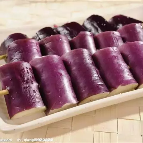 (1)将新鲜茄子放在炭火上烤至皮呈深褐色,取出,以最快的速