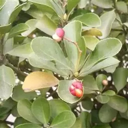 常绿灌木或小乔木,高达8米。 叶光亮革质,倒卵形或窄长椭圆形,长3-6厘米,宽2-3厘米。 聚伞花序腋生,总花梗长2.5-3.5厘米,1-2回2歧分枝,每分枝顶端有5-12花的短梗小聚伞花序;花白色,直径约7毫米,4数,花丝细长,花盘肥大。 蒴果淡红色,近球形,有4浅沟,果梗四薐形,较粗壮。