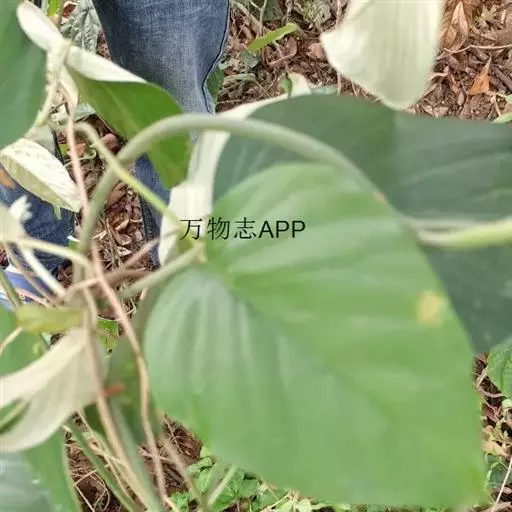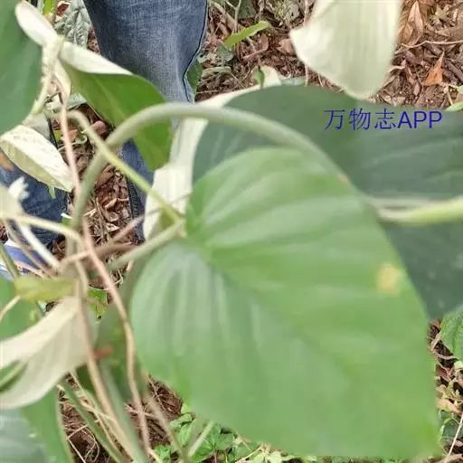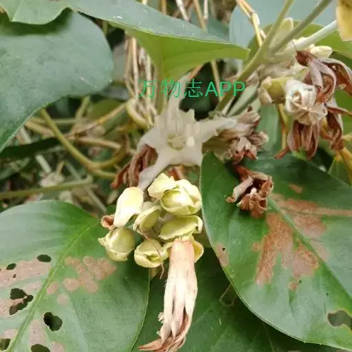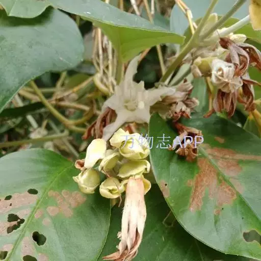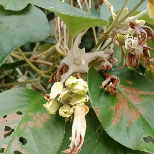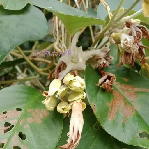 原形态:缠绕藤本。叶卵形至椭圆形,长5~11厘米,宽3~9厘米,先端短尖或钝,基部浑圆或有时微心形,上面秃净或近秃净,下面密被银色紧贴的柔毛。花序腋生或顶生,头状或伞状;花序柄长3.5~7厘米,密被银色柔毛;花柄短,长约5毫米或不及;苞片大,萼片5,矩圆状卵形或卵形,外面的长9~10毫米,内面的较小,外密被银色柔毛;花冠漏斗状,白色,长2.7~2.8厘米,外被银色偃毛,裂片矩圆形,长1.5厘米内外;雄蕊5;子房4室,花柱线形。果近球形,径约8厘米,胭脂色,为卵形凹陷的宿萼所包围。花期秋季。