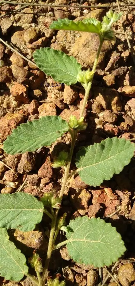 梧桐科匍匐半灌木,高35~150cm,小枝密被短柔毛。叶互生,卵形或长椭圆状卵形,长2~4.5cm,宽1.5~3cm,先端钝,基部圆形或浅心形,边缘有不规则小齿,两面密被星状短柔毛;叶柄长0.5~1cm。聚伞花序腋生,头状,总花梗长0.3~1.6cm;小苞片狭披针形,长约4mm;花萼筒状,5裂,裂片三角形,远较萼筒长,外面被柔毛;花瓣5,淡黄色,矩圆状匙形,比萼略长;雄蕊5,花丝合生成筒状,包围着雌蕊,与花瓣对生;子房无柄,被短柔毛,花柱偏生,柱头流苏状。