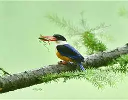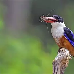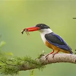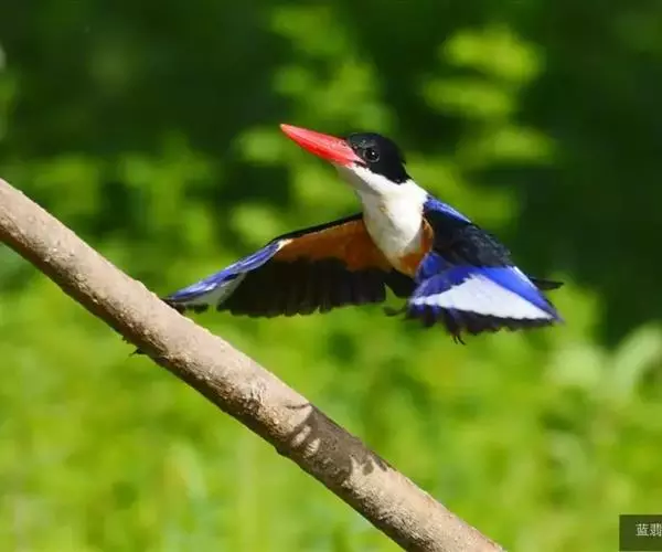 蓝翡翠(学名:Halcyon pileata)是翠鸟科翡翠属的鸟类。体长雄性278-310毫米,雌性250-310毫米;寿命10年。是一种以蓝色、白色及黑色为主的翡翠鸟。以头黑为特征,翼上覆羽黑色,上体其余为亮丽华贵的蓝紫色。两胁及臀沾棕色。飞行时白色翼斑显见。主要是留鸟,部分为夏候鸟,嘴粗长似凿,基部较宽,嘴峰直,峰脊圆,两侧无鼻沟;翼圆,第1片初级飞羽与第7片初级飞羽等长或稍短,第2、3、4片几近等长;初级飞羽基部具白色斑;尾圆形。以鱼为食,也吃虾、螃蟹、蟛蜞和各种昆虫。常单独站立于水域附近的电线杆顶端,或较为稀疏的枝丫上,伺机猎取食物。晚间到树林或竹林中栖息。