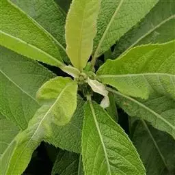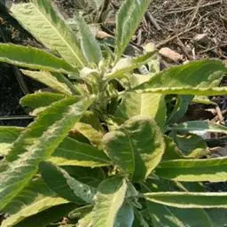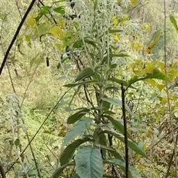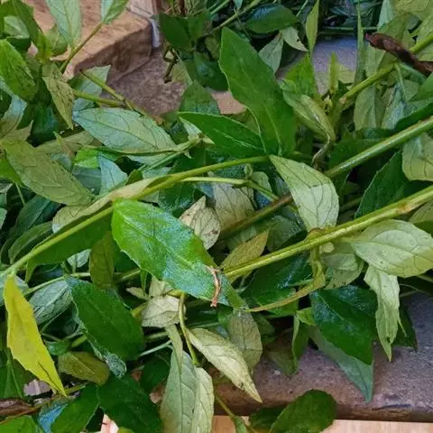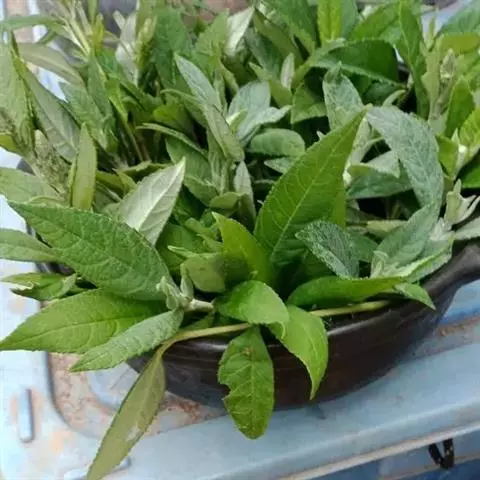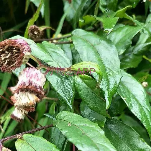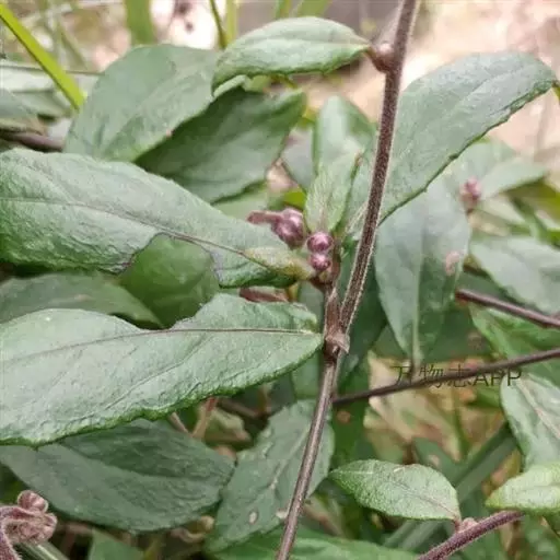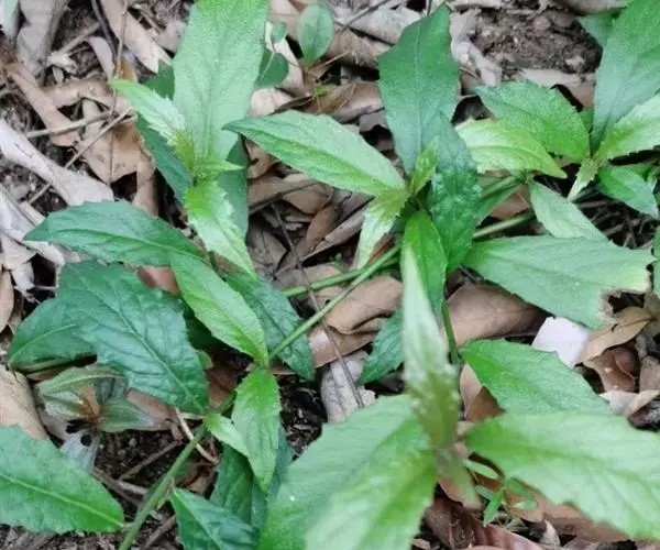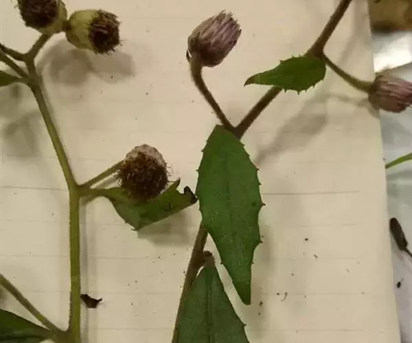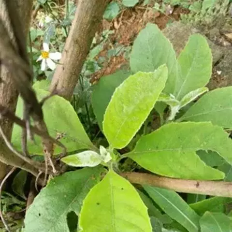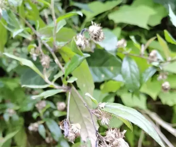 茎表面浅棕色,近无毛。叶多皱缩破碎。完整叶片椭圆形或卵状椭圆形,长7-10cm,宽2.5-4cm,顶端尖,基部楔形或圆形,浅棕褐色,上面粗糙,无毛,下面被微毛或近无毛,边缘具小齿,网脉极明显,叶柄长2-5mm,被柔毛。有的残留有头状花序。气微,味微苦。
