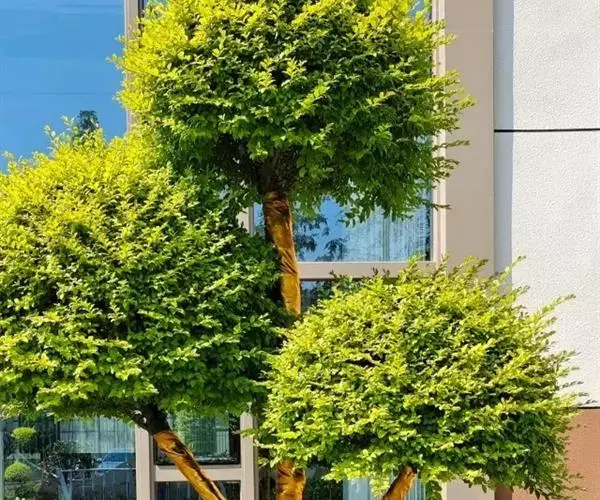 中华金叶榆属密枝型白榆,具有造型容易、种类丰富的特点。由于其枝条萌生量大,生长速度快,一般1年生苗即可进行修剪造型。常见的有高球型、低球型、乔木双层造型、乔木多层造型、柱型、动物型等。各类造型均以白榆为砧木进行嫁接而成。高球型一般在砧木离地面1m处嫁接,接后第二年春季进行修剪成球;低球型在砧木离地面5m处进行嫁接,接后第二年春季进行修剪成球;乔木双层、多层造型是在主干高度2m以上的砧木上进行,分别在地面1m处或2m处、 处进行嫁接,生长1年后进行修剪,可修成方型、球型、三角型等多种造型;柱型中华金叶榆可用底部嫁接苗经4~5年时间培养,或在主干通直的砧木上密集嫁接,反复修剪而成;动物型是最为费工的一种,需要结合盘扎、嫁接、修剪多道工艺而成,也是市场价值最高的一种。各类造型均具有造型丰满、颜色金黄的特点,观赏性优于普通绿色品种。
