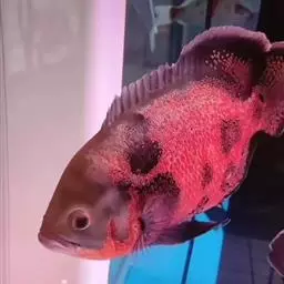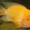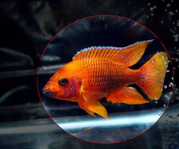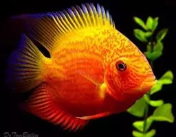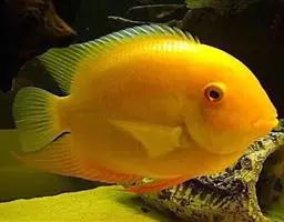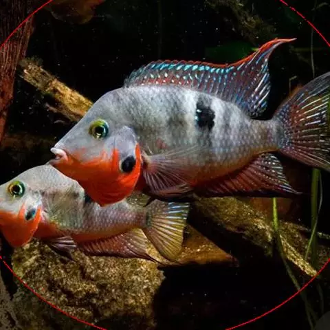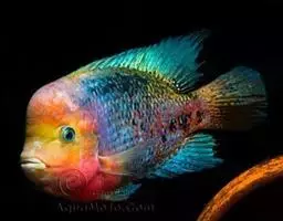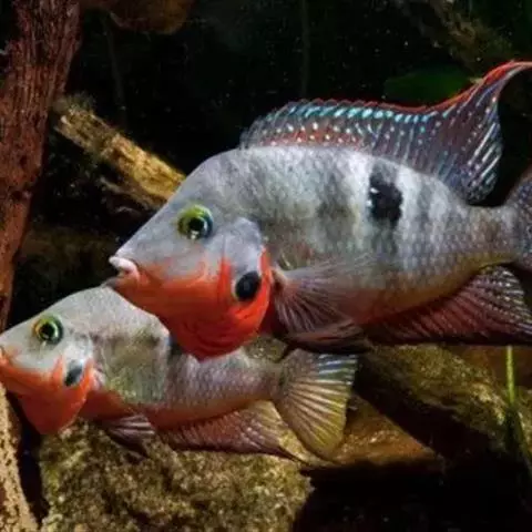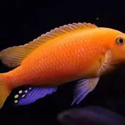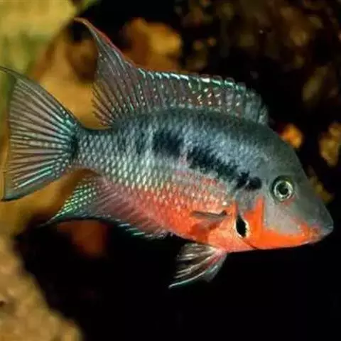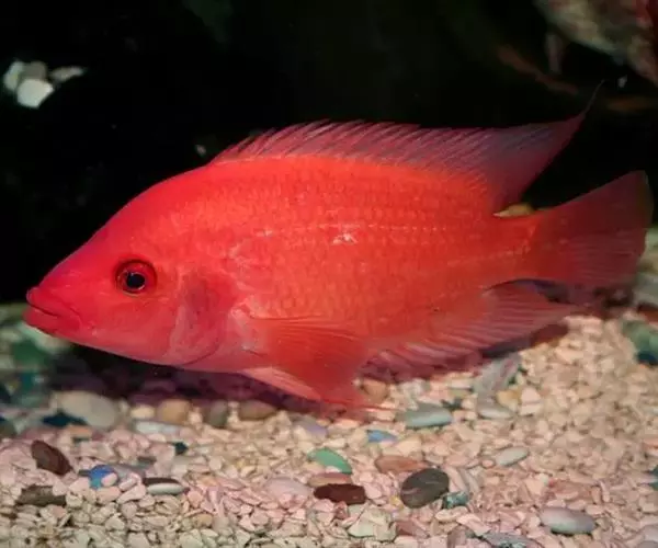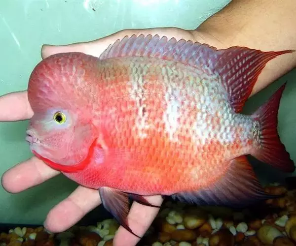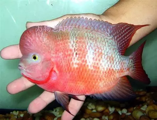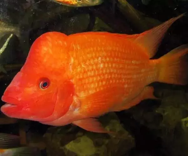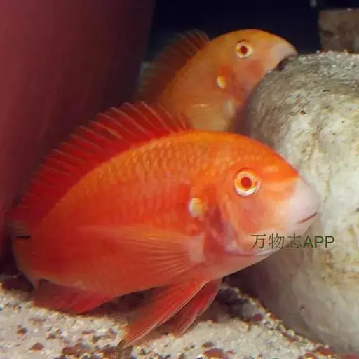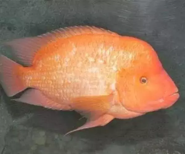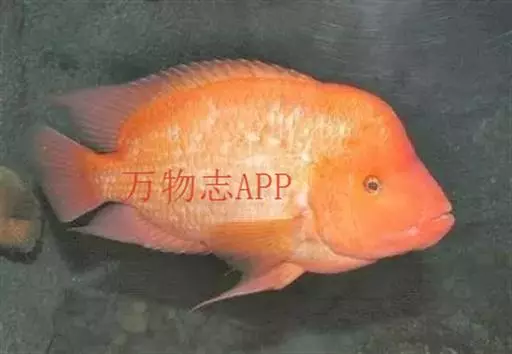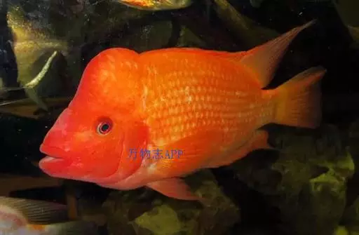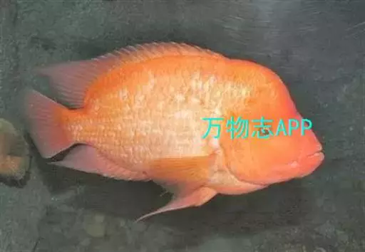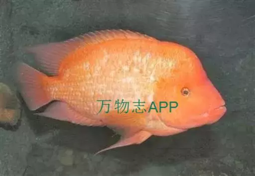 大型慈鲷,体格强健,厚侧扁形,约25厘米,大者可长达30厘米,全身橘红或鲜红,雄性额头半球状突起,高于颅顶,为全身制高点,雌鱼额头仅稍稍隆起。雄鱼背鳍和臀鳍的后缘鳍条延长。血鹦鹉鱼的父本,金刚鹦鹉鱼的母本。捕食性鱼类。