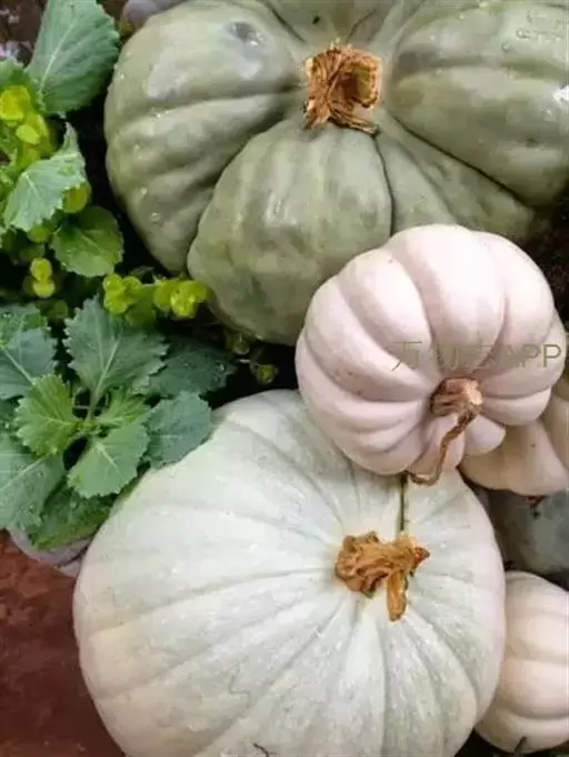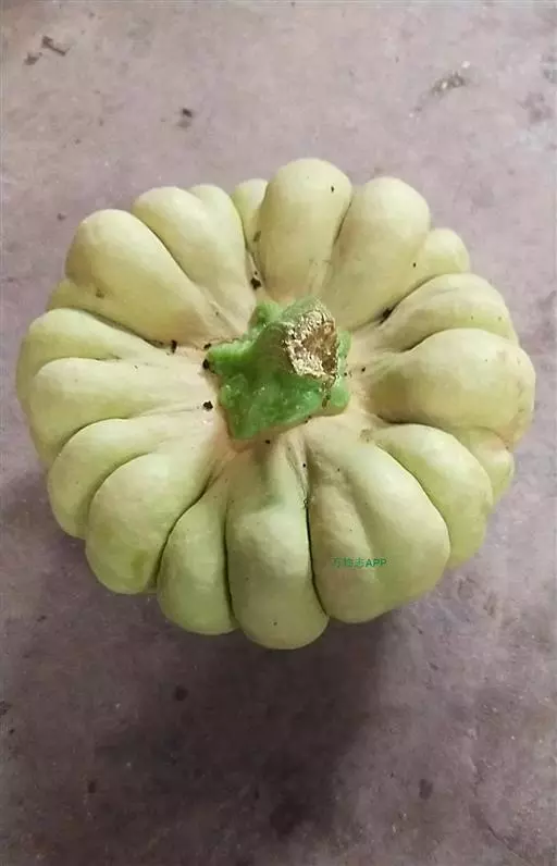 瓜形似佛手,又似皇冠,形状怪异又名“小丑南瓜”,浅黄白色,瓜长11厘米左右,高8厘米,重约130克。