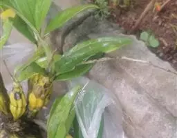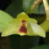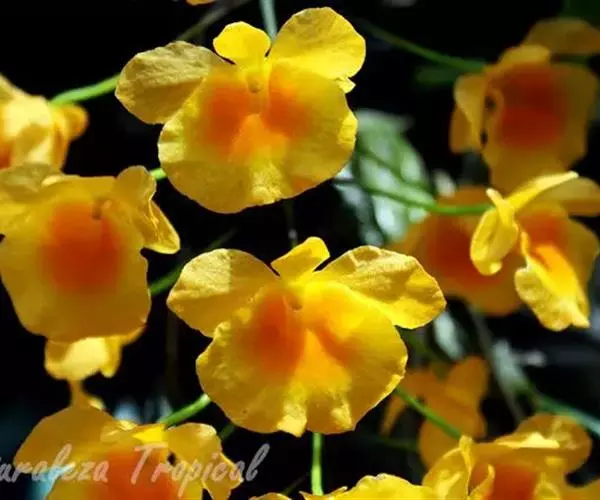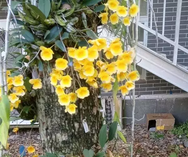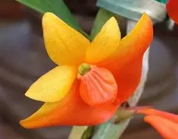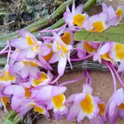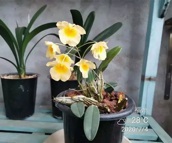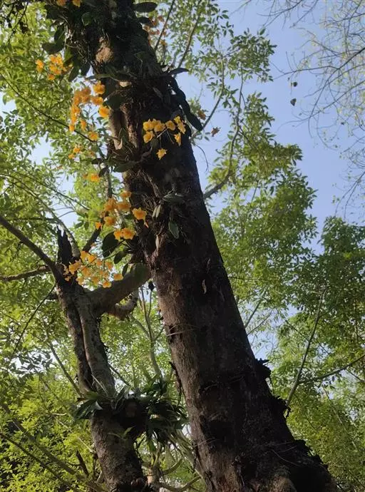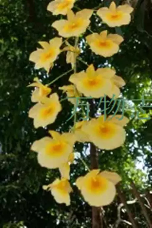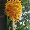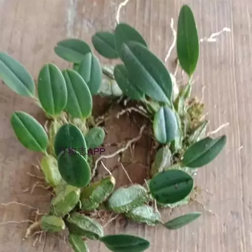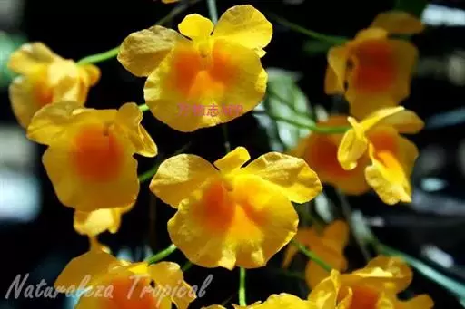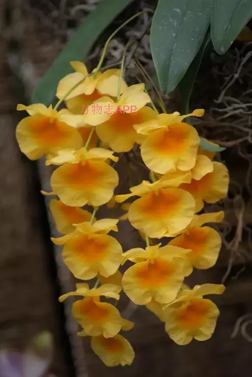 聚石斛,,顶生叶1枚,矩圆形,先端钝或微凹,边缘多少波状;6月开花,总状花序生于新茎上部节上,有花5~12朵,橙黄色,唇瓣近圆形,质地薄,形如金币,非常美丽。