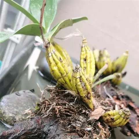 附生兰,假鳞茎密集附生于树干上,纺锤形,两侧压扁,具2~5节,又名“上树虾”。产云南勐海、河口、西畴;附生于海拔270~1400米的石灰岩山次生常绿阔叶林中树干上。