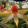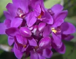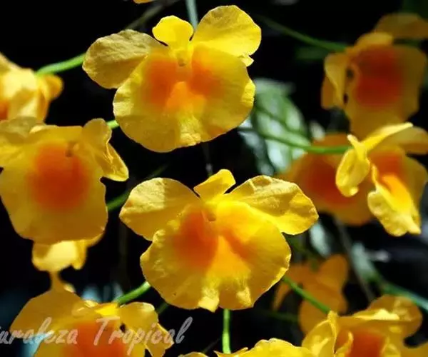 总状花序从茎上端发出,远比茎长,长达28厘米,疏声生数朵至10余朵花;花苞片小, 聚石斛 狭卵状披针形,长约2毫米;花梗和子房黄绿色带淡紫色,长3~5厘米;花橘黄色,开展,质薄;中萼片卵状披针形,长约2厘米,宽7~8毫米,先端稍钝;侧萼片与中萼片近等大;萼囊近球形,长约5毫米;