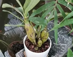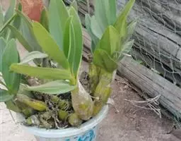 茎假鳞茎状,密集或丛生,多少两侧压扁状,纺锤形或卵状长圆形,通常2~5节,长1~5厘米,粗5~15毫米,顶生1枚叶,基部收狭,干后淡黄褐色,具光泽;节间长1~2厘米,被白色膜质鞘。