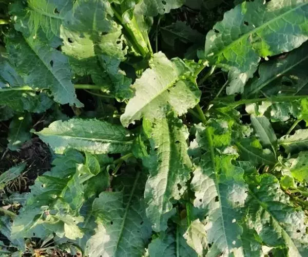 榨菜(通称) 菱角菜、羊角儿菜(四川)下部叶的叶柄基部肉质,膨大,形成高低不平的拳状;基生叶倒卵形或长圆形,长40-80厘米,平坦或皱缩,基部大头羽状深裂,成为具沟的粗叶柄。