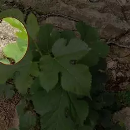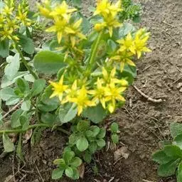 块根肉质,粗大,坚实,长圆球形,顶部不缩小,外皮及根肉均为黄棕色,下面生多数须根;基生叶及下部茎生叶长圆状卵形,长20-30厘米,有粗齿,稍具粉霜。