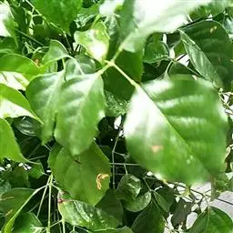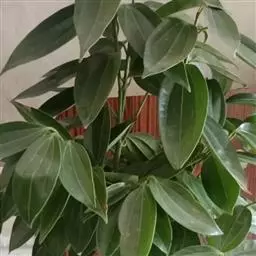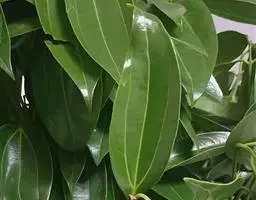 2、阴香。常绿乔木,高达20m。小枝赤褐色,无毛。叶近于对生或散生,革质,卵形或长椭圆形,长6-10cm,宽2-4cm,先端短渐尖,基部楔形至近圆形,全缘;上面绿色,有光泽,下面粉绿色,两面均无毛,具离基3出脉,脉腋内无隆起的腺体;叶柄长8-12mm。圆锥花序顶生或腋生;花小,绿白色,花被6,基部略合生,长4-5mm,两面均被柔毛;能育雄蕊9,排成3轮,外面2轮花药内向,第3轮花药外向,花药均为卵形,4室,瓣裂,花丝短,最内尚有1轮退化雄蕊;雌蕊1,子房上位,1室,1胚珠,花柱细,柱头小。浆果核果状,卵形,长不及1cm,直径约5mm,基部具肥厚杯状的宿存花被,其先端具6截形短裂片。花期3-4月。果期4-10月。
