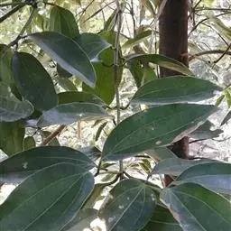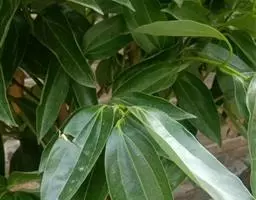 3、细叶香桂,常绿高大乔木。树皮灰色,小枝密生绢状毛。叶在新枝对生,在老枝互生,革质,卵状椭圆形至披针形,长4-14cm,宽1-6cm,先端长渐尖,基部楔形,全缘,上面绿色,有光泽,下面密生绢状短柔毛,具离基3出脉,在背面显着隆起。圆锥花序腋生;总花梗和花梗密生白色短柔毛;花淡黄色,花被6裂,基部筒状;雄蕊、雌蕊与前种相似。浆果椭圆形,基部具宿存萼筒,全缘。花期5-6月。果期6-12月。