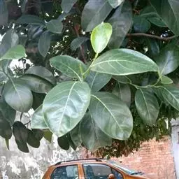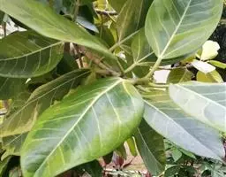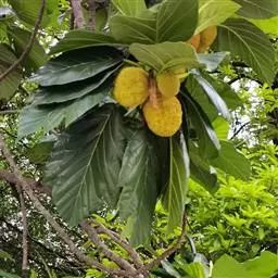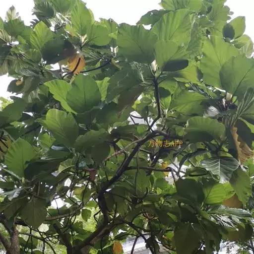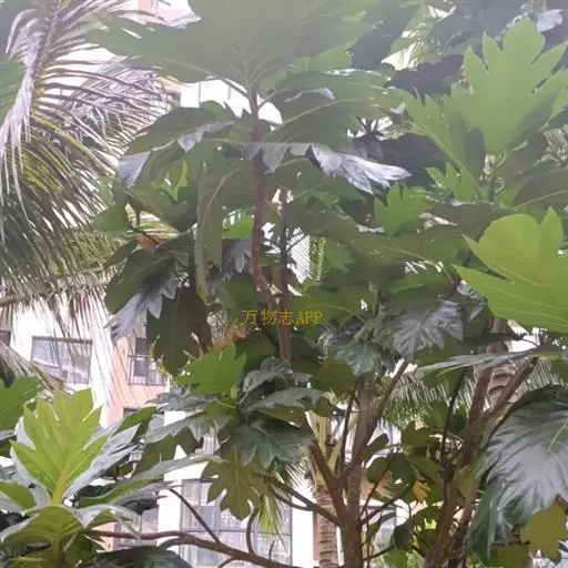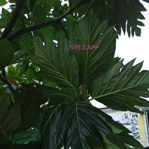 面包树(学名:Artocarpus incisa (Thunb.) L.)桑科常绿乔木,高10-15米;树皮灰褐色,粗厚。叶大,互生,厚革质,卵形至卵状椭圆形,两面无毛,表面深绿色,有光泽,背面浅绿色,全缘;叶柄长8-12厘米;托叶大,披针形或宽披针形,黄绿色,被灰色或褐色平贴柔毛。花序单生叶腋,雄花序长圆筒形至长椭圆形或棒状,黄色;雄花花被管状,被毛,上部2裂,裂片披针形,花药椭圆形,花柱长,聚花果倒卵圆形或近球形,绿色至黄色,表面具圆形瘤状凸起,成熟褐色至黑色,柔软,内面为乳白色肉质花被组成;核果椭圆形至圆锥形。栽培的很少核果或无核果。