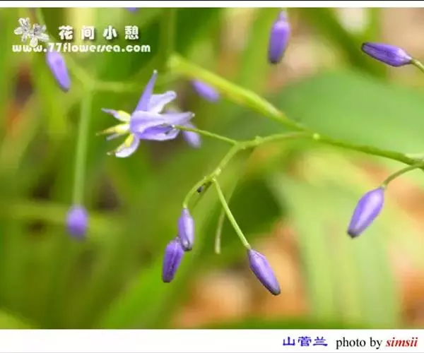 山菅兰,正名为山菅(拉丁学名:Dianella ensifolia),百合科山菅属草本植物,株高0.3-0.6米,叶线形,2列基生,革质,花序顶生,花青紫色或绿白色。浆果紫蓝色,球形,成熟时有如蓝色宝石。