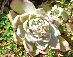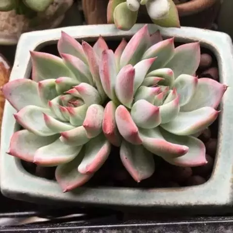 蜡牡丹,Echeveria nuda,景天科,拟石莲花属。蜡牡丹,是属内较为特殊的一个种类。植株易生侧芽,常形成群生状。叶片肉质厚实,轮生,卵圆形或心形,叶端有钝尖,叶面不平,呈中间内凹,两边中心部位凸起,排列紧密成莲花状,几乎看不见茎,组成的叶盘,犹如一朵盛开的微型、精致的牡丹花。叶片常为绿色,但到了秋冬季节,随着温差加大,再加上光照充足,叶色会转变为红色,有的也会变成黄色,并有红色的叶缘,尤其是叶子表面呈蜡质状的油亮光泽,更具有迷人的特质。花期春季。