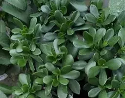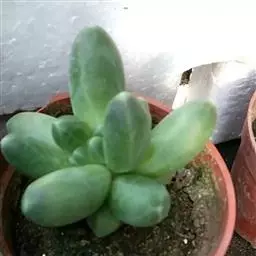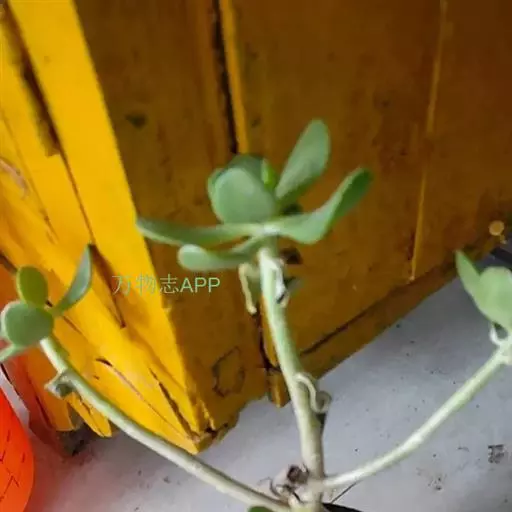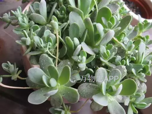 叶肉质肥厚,紫灰色,倒卵形,匙形或椭圆形,宽2.5-3.5厘米,长0.5-1.5厘米,叶尖尖锐,基部渐短粗,全缘,无毛,具白粉。