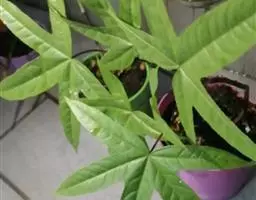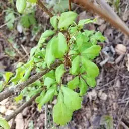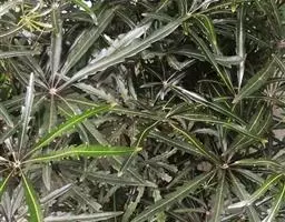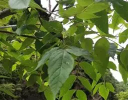 指状复叶3-6个轮生茎顶;托叶多数,簇生,线形,长不足2毫米;叶柄长5-11.5厘米,具条纹,光滑无毛;小叶柄中央的长1.2-3.5厘米,两侧的长0.2-1.2厘米,无毛;叶片膜质 ,中央的最大,长椭圆形至倒卵状长椭圆形,长7-13厘米,宽2-5厘米,先端渐尖至长渐尖,基部阔楔形至圆形,两侧叶片最小,椭圆形至圆状长卵形,长3.5-7厘米,宽1.3-3厘米,先端渐尖至长渐尖,基部偏斜,边缘具重细锯齿,齿尖具短尖头,齿间有1刚毛,两面沿脉疏被刚毛,主脉与侧脉在两面凸起,网脉不显。