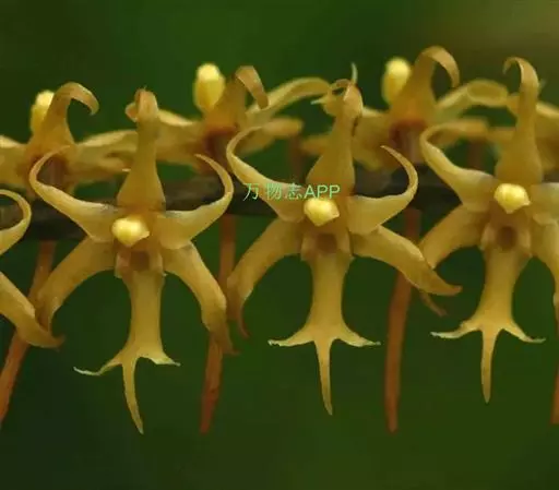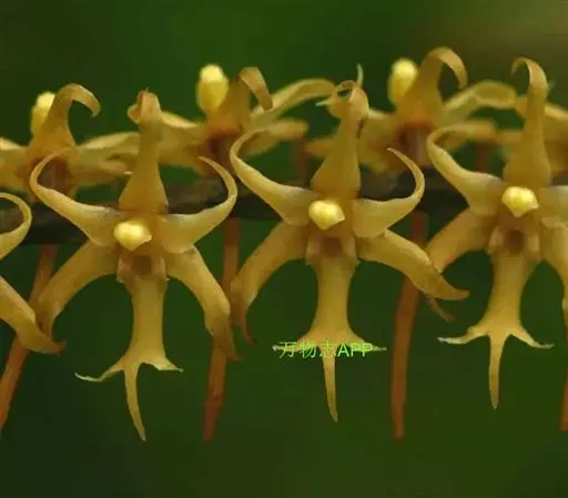 直立或附生蔓性灌木,除花冠喉内部外,全株无毛。叶坚纸质,椭圆状长圆形,长8-16厘米,宽2-4.5厘米;侧脉不明显。伞形状聚伞花序腋外生或顶生,向下弯,着花10-15朵;花萼内面基部有5-6个腺体;花冠黄白色,5深裂,开放后强度反折,花冠喉韵为具长硬毛;副花冠5裂,裂片披针形,着生于合蕊冠背部,其基部延生角状长距,成星状射出;花粉块长圆形,直立。蓇葖单生,线状披针形,长12-16厘米,直径1厘米,无毛;种子卵形,长4毫米,宽2毫米,顶端具白色绢质种毛;种毛长4厘米。花期5-7月,果期10-12月。
