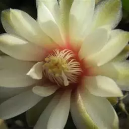 鸾凤玉 植株球形,老株变为细长筒状。球体直径10~20厘米,有3~9条明显的棱,多数为5棱。棱上的刺座无刺,但有褐色绵毛。球体灰白色密被白色星状毛或小鳞片。花朵着生在球体顶部的刺座上,漏斗形,黄色或有红心。三棱的“三角鸾凤玉”较稀有名贵,四棱的“四角鸾凤玉”也称四方玉,四条阔棱均匀对称,也很有趣。