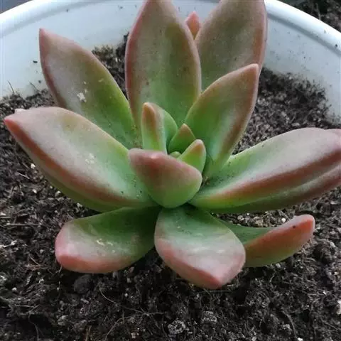 乔伊斯·塔洛克,多年生小型多肉草本植物。植株直立,易生侧芽,且侧芽多,常形成枝繁叶茂的群生株。叶子匙形,或舟形,叶面较平滑,中间略凹陷,叶背面凸起,龙骨不明显,交互对生或轮生,叶端钝,无小尖,全叶披毫毛。5-10月,一般以绿为叶的主色调,叶缘稍有红晕;11月至翌年4月,叶的基色调以红为主,在重组阳光、大温差和排水良好介质的共同影响下叶片变红。花期4-5月,聚伞花序,开花5瓣,星形,外瓣粉色,内瓣白色,花梗红色。