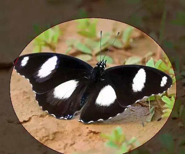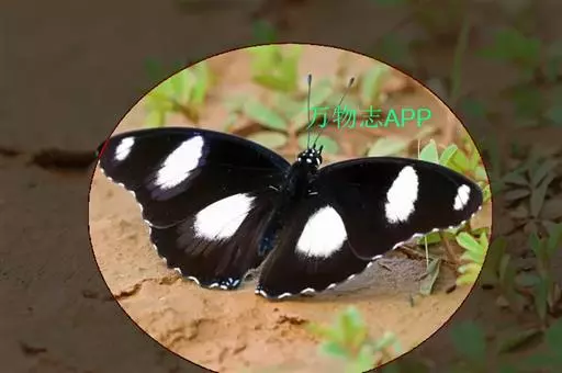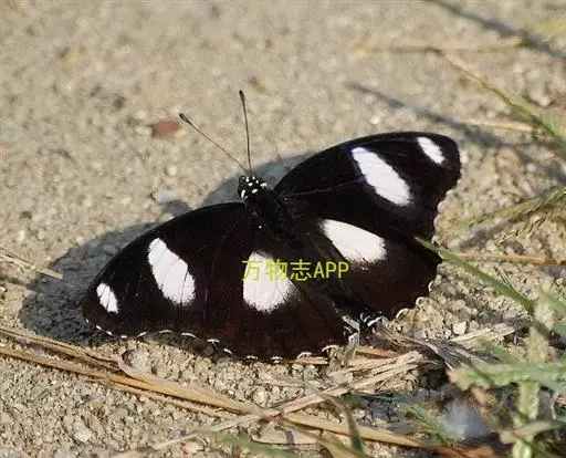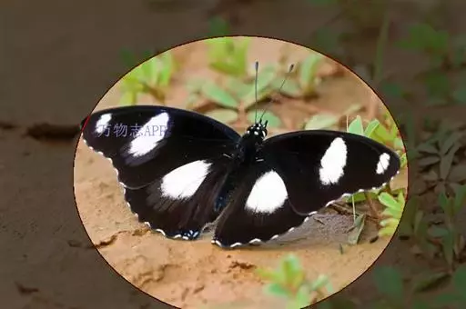 它的雌蝶以幕拟金斑蝶而闻名,雄蝶翅黑褐色,前翅中室外有1个长椭圆形白斑,顶角附近有1个小形白斑;后翅中域有1个大形白斑;前后翅的白都斑有紫色光泽。雌蝶翅橙黄色,顶角有1个较小的白斑,中室外侧有1列宽的白色斜带;后翅外缘黑褐色,前缘有1个黑斑。两翅外缘均有两列成对的小白点。