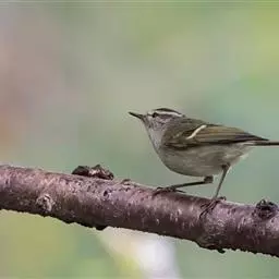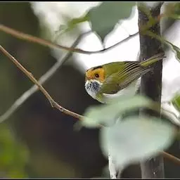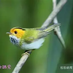 棕脸鹟莺:体长10厘米,是一种色彩亮丽而有特色的莺鸟。头栗色,具黑色侧冠纹。上体绿,腰黄色。下体白,…