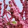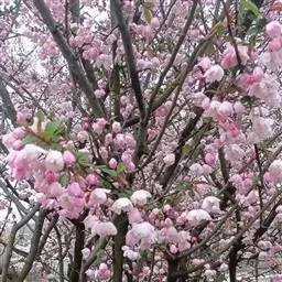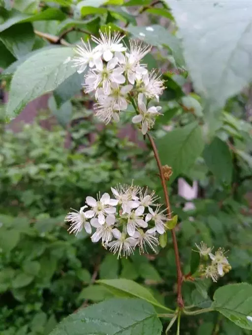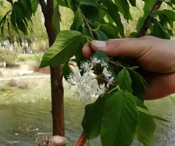 总状花序多花密集,长5-7厘米,基部无叶;花梗长4-6毫米(栽培标本有的可达1.5厘米),总花梗和花梗均被稀疏短柔毛;花直径8-10毫米;萼筒钟状,比萼片长近1倍,萼片三角状披针形或卵状披针形,先端长渐尖,边有不规则带腺细齿,萼筒和萼片内外两面均被疏柔毛;花瓣白色,长圆状倒卵形,先端1/3部分啮蚀状,基部楔形,有短爪,着生在萼筒边缘,为萼片长的2倍;雄蕊25-30,排成紧密不规则2-3轮,花丝长短不等,着生在萼筒上,长花丝比花瓣稍长;雌蕊1,心皮无毛,柱头盘状或半圆形,花柱基部有疏长柔毛,和雄蕊近等长。核果近球形,直径5-7毫米,紫褐色,无毛;果梗无毛;萼片脱落;核有皱纹。花期4-5月,果期6-10月。