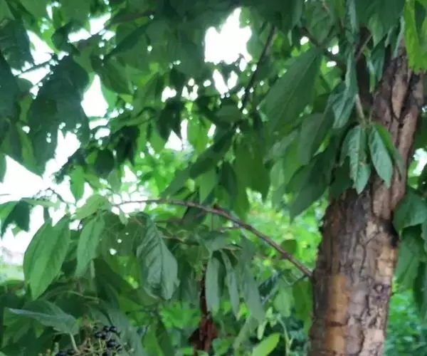 落叶小乔木,高4-10米;树皮光滑成片状剥落;老枝黑褐色或黄褐色,无毛;小枝带红色,幼时被短柔毛,以后脱落近无毛;冬芽卵圆形,无毛或在鳞片边缘被短柔毛。叶片椭圆形、菱状卵形,稀长圆状倒卵形,长4-8厘米,宽2.8-5厘米,先端尾状渐尖或短渐尖,基部圆形或宽楔形,叶边有不规则带腺锐锯齿,上面深绿色,仅沿叶脉被短柔毛,其余部分无毛或近无毛,下面淡绿色,沿中脉被短柔毛,被紫褐色腺体;叶柄长1-1.5厘米,被短柔毛,稀近无毛,先端有时有2个腺体,或在叶片基部边缘两侧各有1腺体;托叶膜质,线形,先端渐尖,边有腺体,早落。