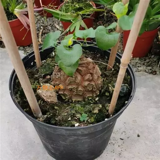 龟甲龙日常浇水时, 也要注意就是在要长出藤条的时候, 请不要把水滴到生长点上, 也就是吐出藤条的地方。等待着第一根茎蔓出现, 那时就可以正常浇水了。浇水尽量选择在晴天的中午, 不要让他落叶, 这样植株就不会休眠。还有一点值得注意就是不要像栽培其他热带植物那样, 让它总处于潮湿的环境中。需不需要浇水主要是看盆里面是否快要“几乎”干透了。过量浇水只会引起腐烂造成死亡。