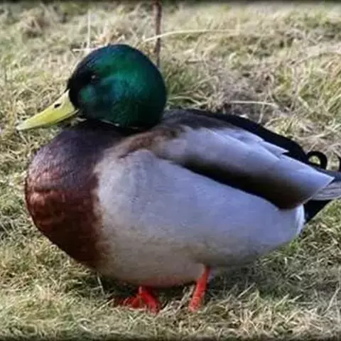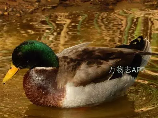 绿头鸭(学名:Anas platyrhynchos)属游禽,大型鸭类。体长47-62厘米,体重大约1千克,外形大小和家鸭相似。雄鸟嘴黄绿色,脚橙黄色,头和颈辉绿色,颈部有一明显的白色领环。上体黑褐色,腰和尾上覆羽黑色,两对中央尾羽亦为黑色,且向上卷曲成钩状;外侧尾羽白色。胸栗色。翅、两胁和腹灰白色,具紫蓝色翼镜,翼镜上下缘具宽的白边,飞行时极醒目。雌鸭嘴黑褐色,嘴端暗棕黄色,脚橙黄色和具有的紫蓝色翼镜及翼镜前后缘宽阔的白边等特征。
