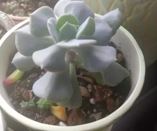 叶片叶基部为扭曲的匙形,两侧边缘向外弯曲,导致中间部分拱突,而叶片的先端向生长点内弯曲,叶背中央有一条明显的沟,表面覆有一层厚厚的天然白霜,呈莲座状排列, 抹掉白粉后为蓝绿色或灰绿色;长6-8厘米,宽2.5-4厘米。在光照充足的环境下呈现出淡淡的粉红色。