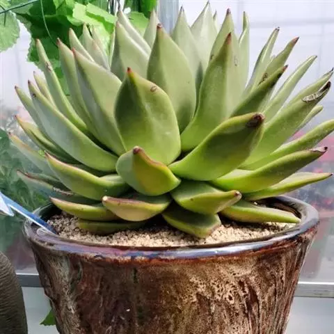 无茎。叶片多数,呈莲座状紧密排列;叶厚,乳绿色,基部很宽,前端渐狭,叶尖锐利。花浅红色。形似小型的龙舌兰。