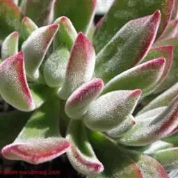 叶15-20枚,呈莲座状紧密排列,卵形,长1.5-2英寸(*约合3.81-5.08厘米),中部宽约1英寸(*约合2.54厘米),中部厚约0.375英寸(*约合0.95厘米),渐狭,顶端具硬质的锐尖,叶面轻微下凹,叶背有弧度,两面均呈浅灰绿色,网状排布极微小的乳突,老叶叶缘略呈红色。