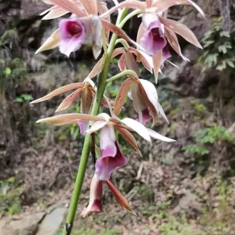 景洪石斛:茎直立,细圆柱形,多少木质化,上部常分枝,基部上方2-3个节间膨大呈纺锤形;膨大部分的茎…