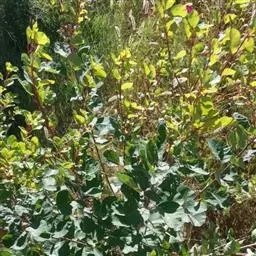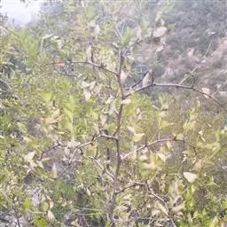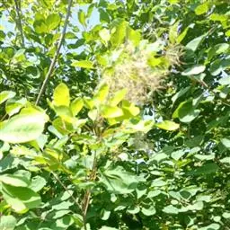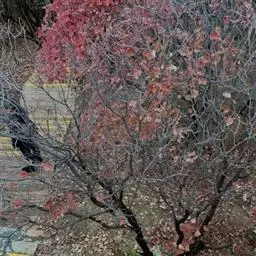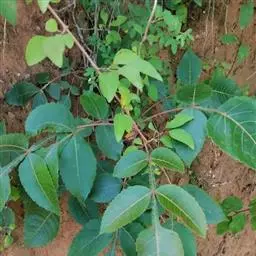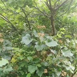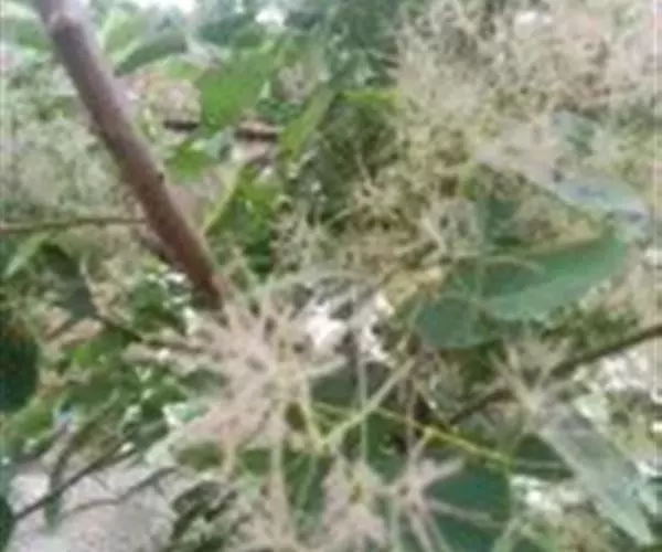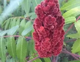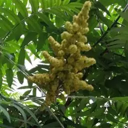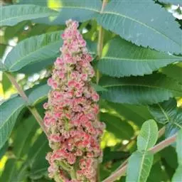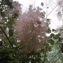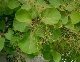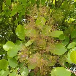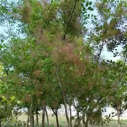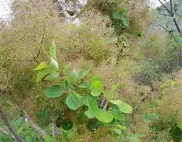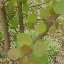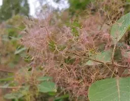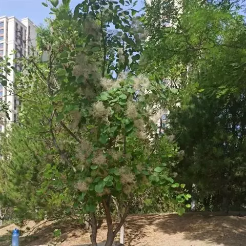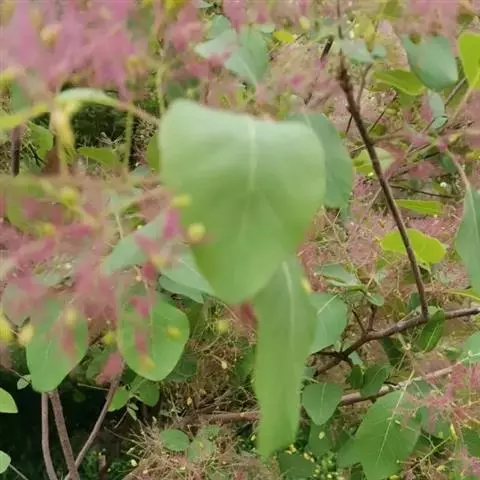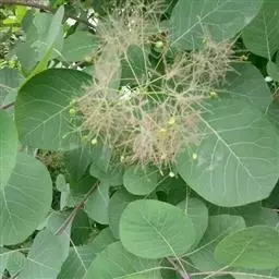 粉背黄栌 灌木,高2—7米;小枝圆柱形,棕褐色,无毛。叶互生,纸质,卵圆形,长3.5—10厘米,宽2.5—7.5厘米,先端微凹或近圆形,基部圆形或浅心形,全缘,两面无毛,叶背明显被白粉;叶柄长1.5—3.3厘米,上面平。圆锥花序顶生,无毛,长达23厘米;花杂性,黄绿色;苞片技针形,长约1.5毫米;花柄长约3毫米,纤细;花萼5裂,裂片狭三角状披针形,长约1.1毫米,宽约0.5毫米,无毛,先端短尖;花瓣5,卵形或卵状椭圆形,长约1.6毫米,宽约0.9毫米,无毛;雄蕊5,长约1.2毫米,花丝近钻形,花药卵圆形,与花丝等长;花盘大,黄色,盘状;子房近球形,偏斜,径约0.4毫米,无毛,花柱3,分离,近顶生。核果棕褐色,无毛,具皱纹,近肾形,长4-4.5毫米,宽2.5—3毫米。