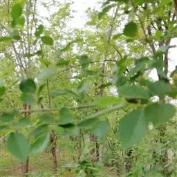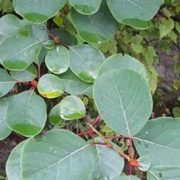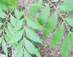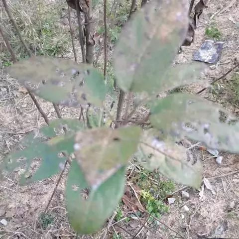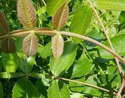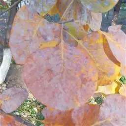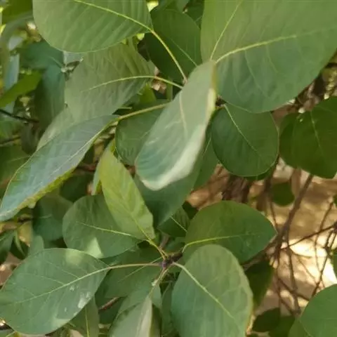 粉背黄栌叶卵圆形,较大,长3.5-10厘米,宽2.5-7.5厘米,无毛,但叶背显著被白粉;叶柄较长,1.5-3.3厘米,与欧洲产的原变种显著不同。