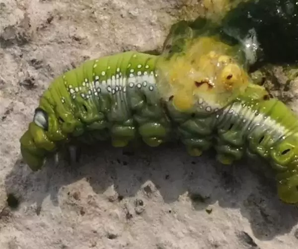 烟草天蛾,幼虫身体的每一侧均布满斜纹,这种昆虫在美国最为常见,由于喜欢吃很多种蔬菜作物的叶子和茎,它们被视为一种害虫。这只独特的天蛾幼虫被众多白色棉花状昆虫覆盖。它们是绒茧蜂,幼年时将天蛾幼虫的身体当成自己的家。白色的好似米粒一样的东西实际上是绒茧蜂的卵。