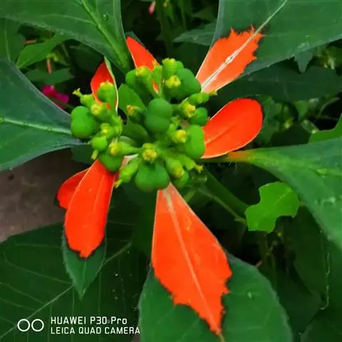 叶子表面宽厚,富肉质感且带有磨纱质感,看像石头质地;开红色小花,生于植株顶部,倒伞形密生,形状像花…