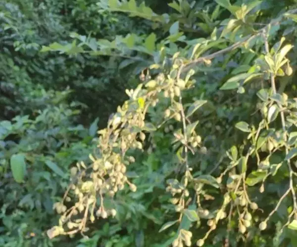 花黄绿色,杂性,雄花与两性花同株,常成无毛的伞房花序,长5厘米,直径8厘米;总花梗长1-2厘米;萼片5,黄绿色,长圆形,先端钝形,长4-5毫米;花瓣5,淡黄色或淡白色,长圆倒卵形,长5-7毫米;雄蕊8,生于雄花者长2-3毫米,生于两性花者较短,着生于花盘的内缘,花药黄色,花丝无毛;花盘微裂;子房嫩时有粘性,无毛,花柱短,仅长1毫米,无毛,2裂,柱头反卷,微弯曲;花梗细瘦,长约1厘米,无毛。