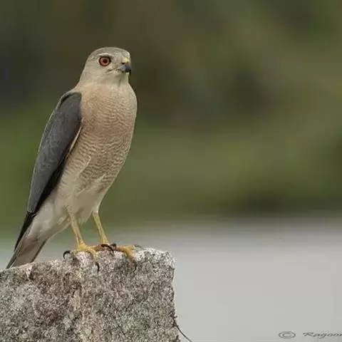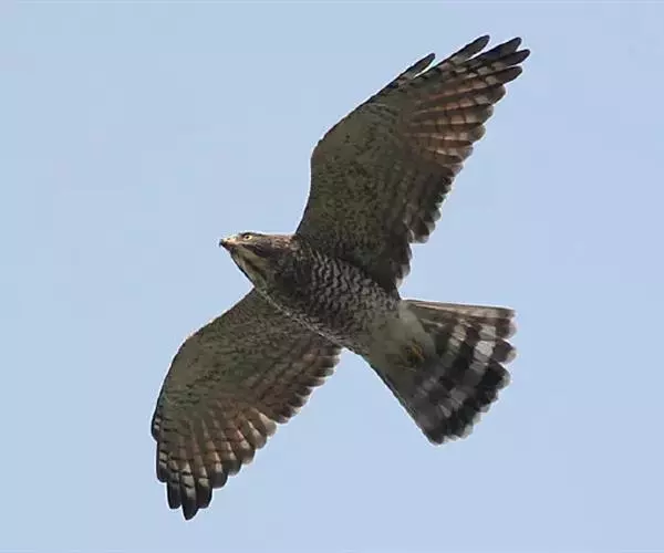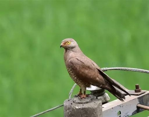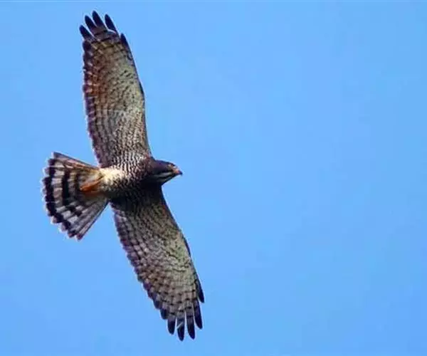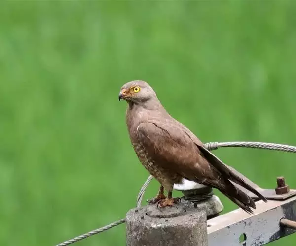 灰脸鵟鹰又叫灰面鹞,为中型猛禽,上体暗棕褐色,翅上的覆羽也是棕褐色;尾羽为灰褐色,与其他2种鵟鹰的棕色尾羽不同,而且上面具有3道宽的黑褐色横斑,比白眼鵟鹰尾羽上的横斑更为明显。脸颊和耳区为灰色,眼先和喉部均为白色,较为明显,喉部还有具有宽的黑褐色中央纵纹,胸部以下为白色,具有较密的棕褐色横斑。它的眼睛为黄色,与白眼鵟鹰不同。嘴为黑色,嘴基部和蜡膜为橙黄色,跗跖和趾为黄色,爪为角黑色。