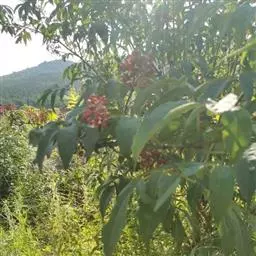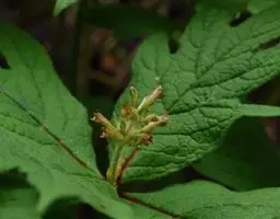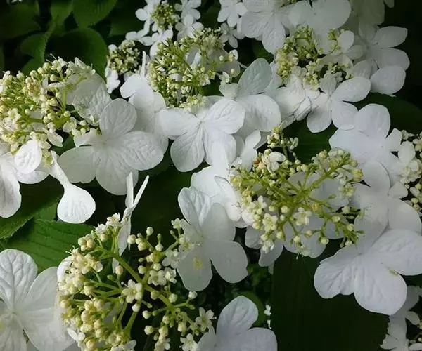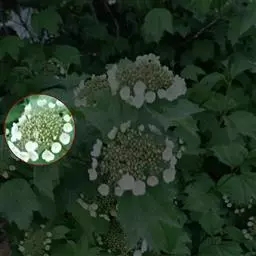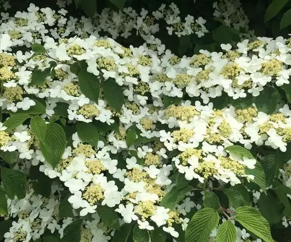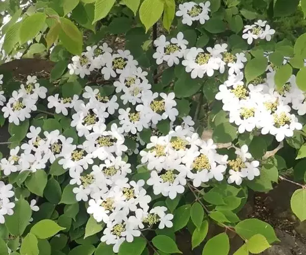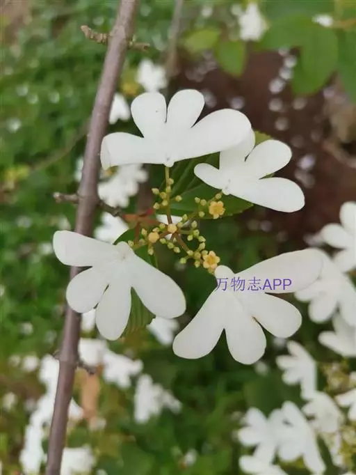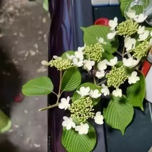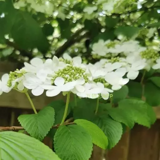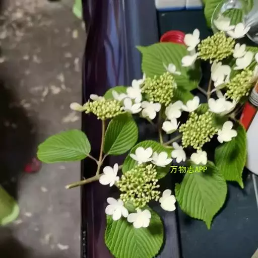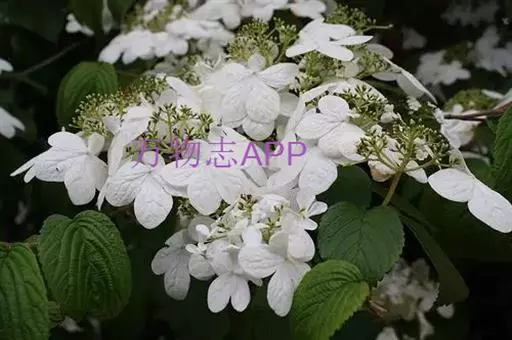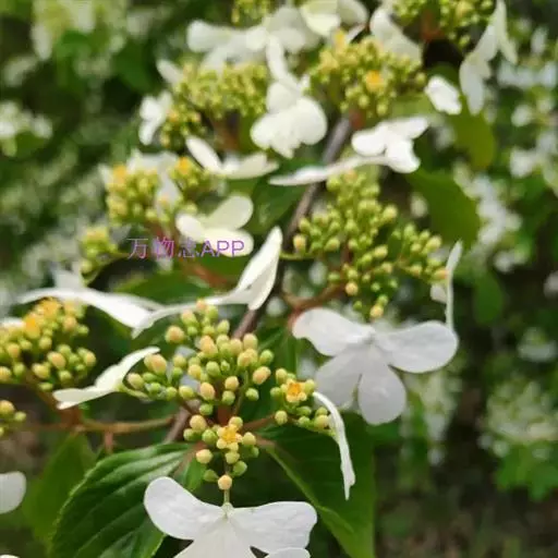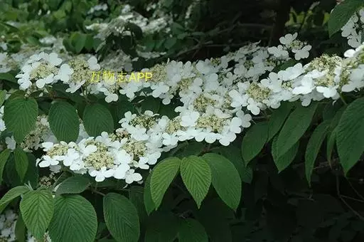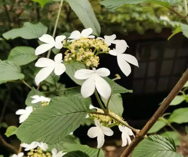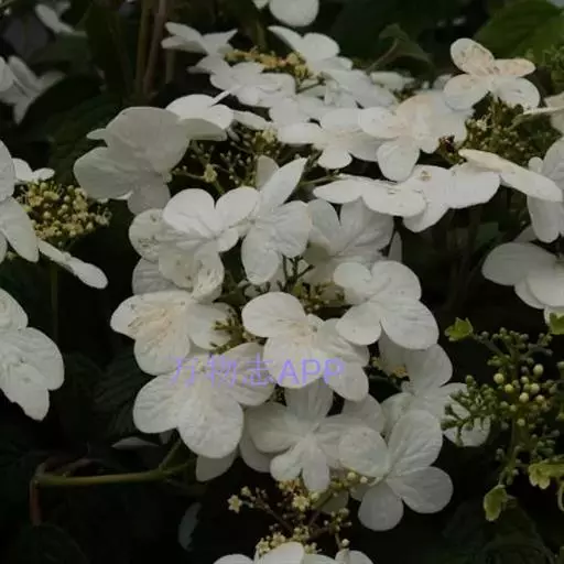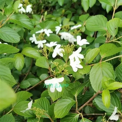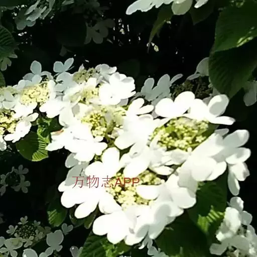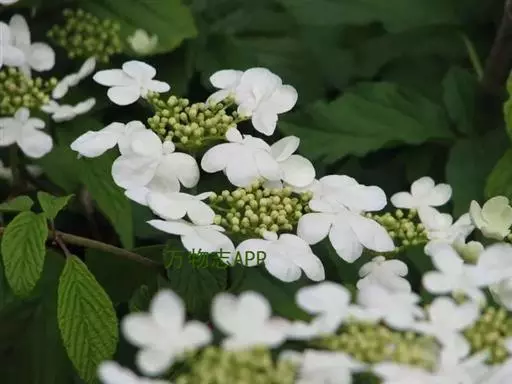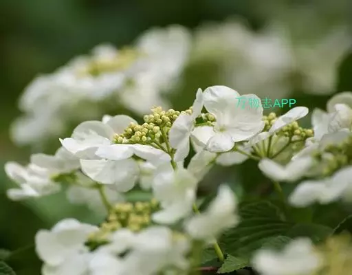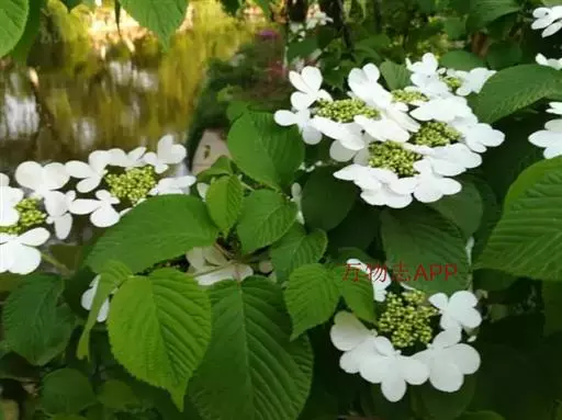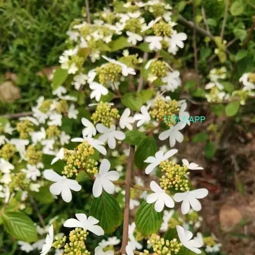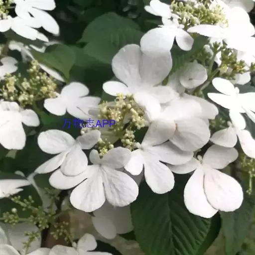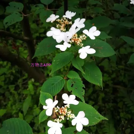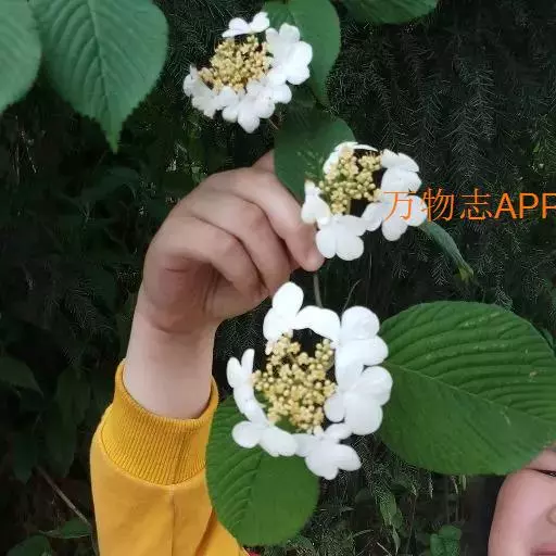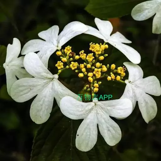 花序直径4-10厘米,外围有4-6朵白色、木型的不孕花,具长花梗,花冠直径达4厘米,不整齐4-5裂;中央可孕花直径约3毫米,萼筒长约15毫米,花冠辐状,黄白色,裂片宽卵形,长约等于筒,雄蕊高出花冠,花药近圆形。果实先红色后变黑色,宽卵圆形或倒卵圆形,长5-6毫米,直径约4毫米;核扁,两端钝形,有1条上宽下窄的腹沟,背面中下部还有1条短的隆起之脊。花期4-5月,果熟期8-9月。