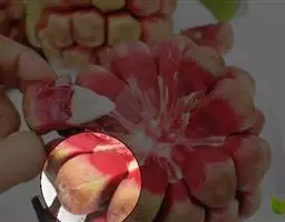 花深红色;雄花;花梗长1-2.8厘米,花被片5-8,近相似,倒卵状椭圆形,最大的长6-14毫米,宽4.5-10毫米,雄蕊群卵圆形,长约8毫米,雄蕊约30-50枚,下部雄蕊具短花丝,上部雄蕊无花丝,花药长0.7-1.4毫米,外侧向开裂,药隔顶端微缺或平;雌花:花梗与花被片与雄花的相似,雌蕊群长圆状椭圆体形,长1厘米,雌蕊80-110枚;子房倒卵形,长约2毫米,鸡冠状柱头面宽约0.5毫米;花柱长约0.5毫米,下延成长约0.5毫米的附属体。