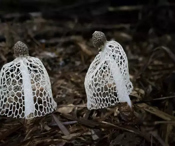 竹荪幼担子果菌蕾呈圆球形,具三层包被,外包被薄,光滑,灰白色或淡褐红色;中层胶质;内包被坚韧肉质。成熟时包被裂开,菌柄将菌盖顶出,柄中空,高15cm~20cm,白色,外表由海绵状小孔组成;包被遗留于柄下部形成菌托;菌盖生于柄顶端呈钟形,盖表凹凸不平呈网格,凹部分密布担孢子;盖下有白色网状菌幕,下垂如裙,长达8厘米以上;孢子光滑,透明,椭圆形,3~3.5×1.5~2微米。