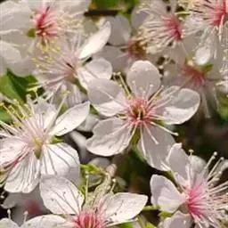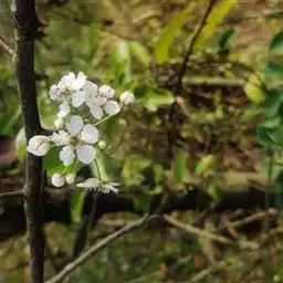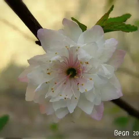 花1朵,稀2朵;花梗长1-2.2厘米,无毛或微被短柔毛;花直径2-2.5厘米;萼筒钟状,萼片长卵形,先端圆钝,边有疏浅锯齿,与萼片近等长,萼筒和萼片外面无毛,萼筒内面有疏生短柔毛;花瓣白色,长圆形或匙形,边缘波状,基部楔形,着生在萼筒边缘;雄蕊25-30,花丝长短不等,紧密地排成不规则2轮,比花瓣稍短;雌蕊1,心皮被长柔毛,柱头盘状,花柱比雄蕊稍长,基部被稀长柔毛。核果近球形或椭圆形,长宽几相等,直径2-3厘米,黄色、红色或黑色,微被蜡粉,具有浅侧沟,粘核;核椭圆形或卵球形,先端急尖,浅褐带白色,表面平滑或粗糙或有时呈蜂窝状,背缝具沟,腹缝有时扩大具2侧沟。花期4月,果期8月。2n=16,17,24。