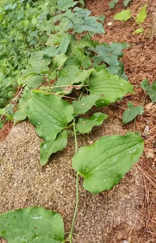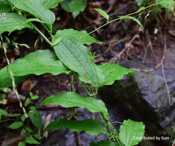 为多年生草质藤本。茎长1-2米,中空,有少量髓,干后凹瘪并具槽。叶比上种厚,形状变化较大,长7-15厘米,宽2.5-11厘米,下面绿色,无毛;叶柄长7-20毫米,通常在中部以下有卷须。伞形花序总花梗较纤细,长3-5(-10)厘米;小苞片长1-2毫米,在花期一般不落;雌花比雄花略小,不具或具钻形退化雄蕊。浆果直径7-9毫米。花期6-7月,果期10月。